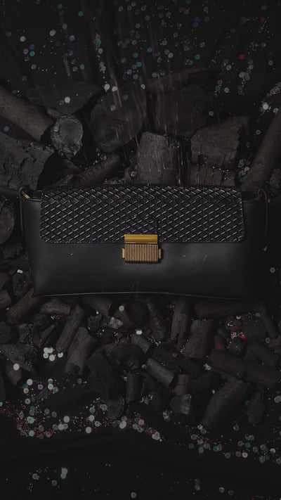 Brass-toned push-lock closure.